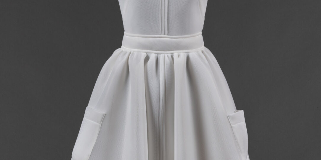Robe courte en polyester élasthanne blanc réalisée par Alexis Mabille pour la collection capsule Monoprix X Alexis Mabille, 2018.